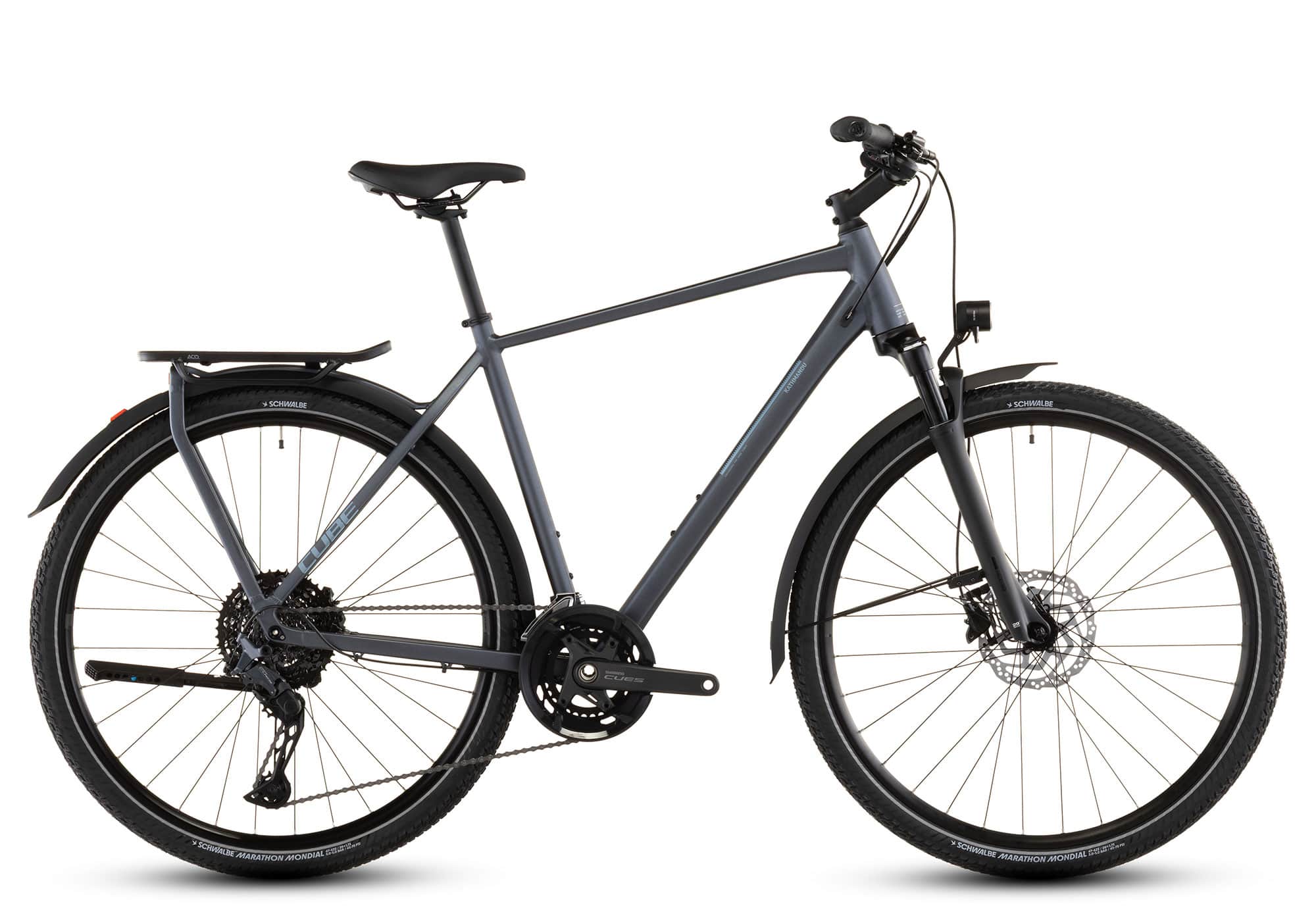 Bei einem Trekkingrad wird meist als erstes auf die Schaltanlage geschaut. Das Cube Kathmandu ist in dieser EXC Ausstattungsvariante mit präzisen und leichten Shimano Cues U6000er Kettenschaltungskomponenten ausgerüstet. Hollowtech II Tretlager, Rapidfire-Plus Schalthebel, 22 wählbare Gangstufen, der Antrieb des Kathmandu EXC kann sich sehen lassen und passt ideal zu Trekkingfahrrädern.
