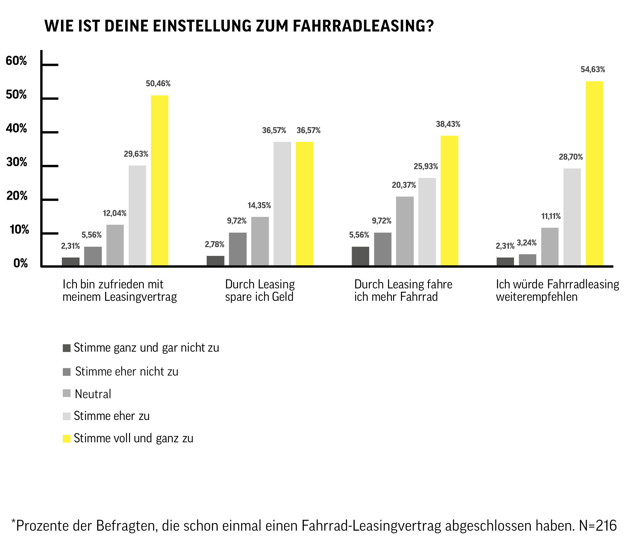 Die Ergebnisse zeigen eine wachsende Begeisterung für Fahrradleasing: 34 Prozent der Befragten haben bereits einen Leasingvertrag abgeschlossen. Die Zufriedenheit mit den bestehenden Verträgen ist hoch, da 80 Prozent der aktuellen oder ehemaligen Leasingnehmenden angeben, mit ihrem Vertrag „voll und ganz“ beziehungsweise „eher zufrieden“ zu sein. Noch beeindruckender ist, dass 83 Prozent der Befragten das Fahrradleasing weiterempfehlen würden und 73 Prozent angeben, durch das Leasing Geld zu sparen.