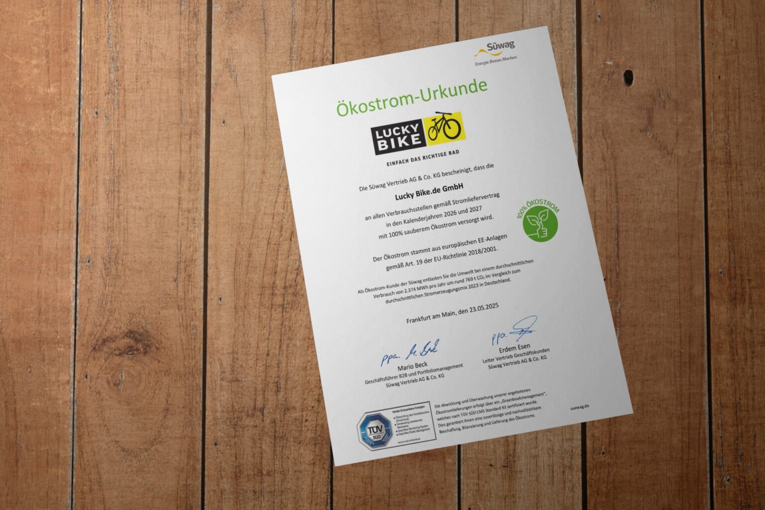 2026 werden all unsere Filialen und Verbrauchsstellen weiterhin offiziell mit 100 % zertifiziertem Ökostrom versorgt. Die Süwag Vertrieb AG & Co. KG hat uns bestätigt, dass die Versorgung in den Kalenderjahren 2026 und 2027 ausschließlich aus erneuerbaren europäischen Energieanlagen erfolgt. Grundlage ist die EU-Richtlinie 2018/2001, die eine klare und transparente Herkunft des Stroms sicherstellt. Die Beschaffung, Bilanzierung und Lieferung des Ökostroms werden durch ein zertifiziertes „Greenbookmanagement“ nach TÜV SÜD-Standard überwacht – damit ist garantiert: Der Strom ist grün und zuverlässig nachvollziehbar.